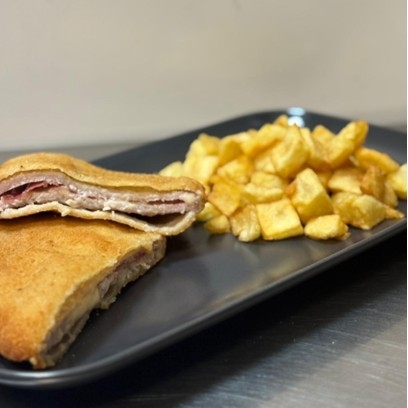 Tradicional San Jacobo relleno de lomo, jamón ibérico y queso acompañado de patatas fritas.